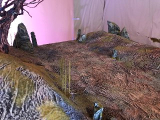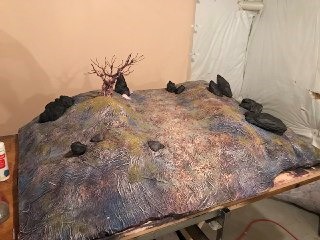 Lets whack on on there. Leftover wire from the clouds in my last set and the noose. Wrap all that good stuff together, cover some holes with cardboard. Stab a whole in the set place it in. Then make a mess of hotglue to give it some nice texture. Whallah.